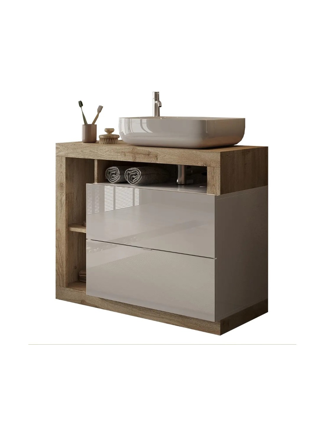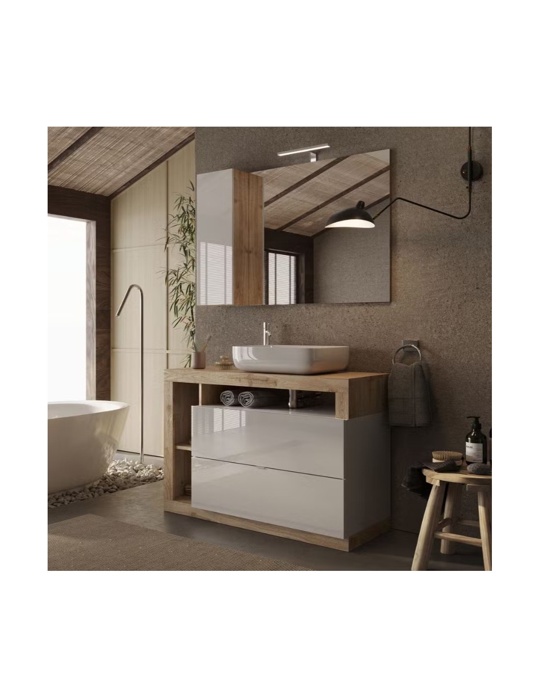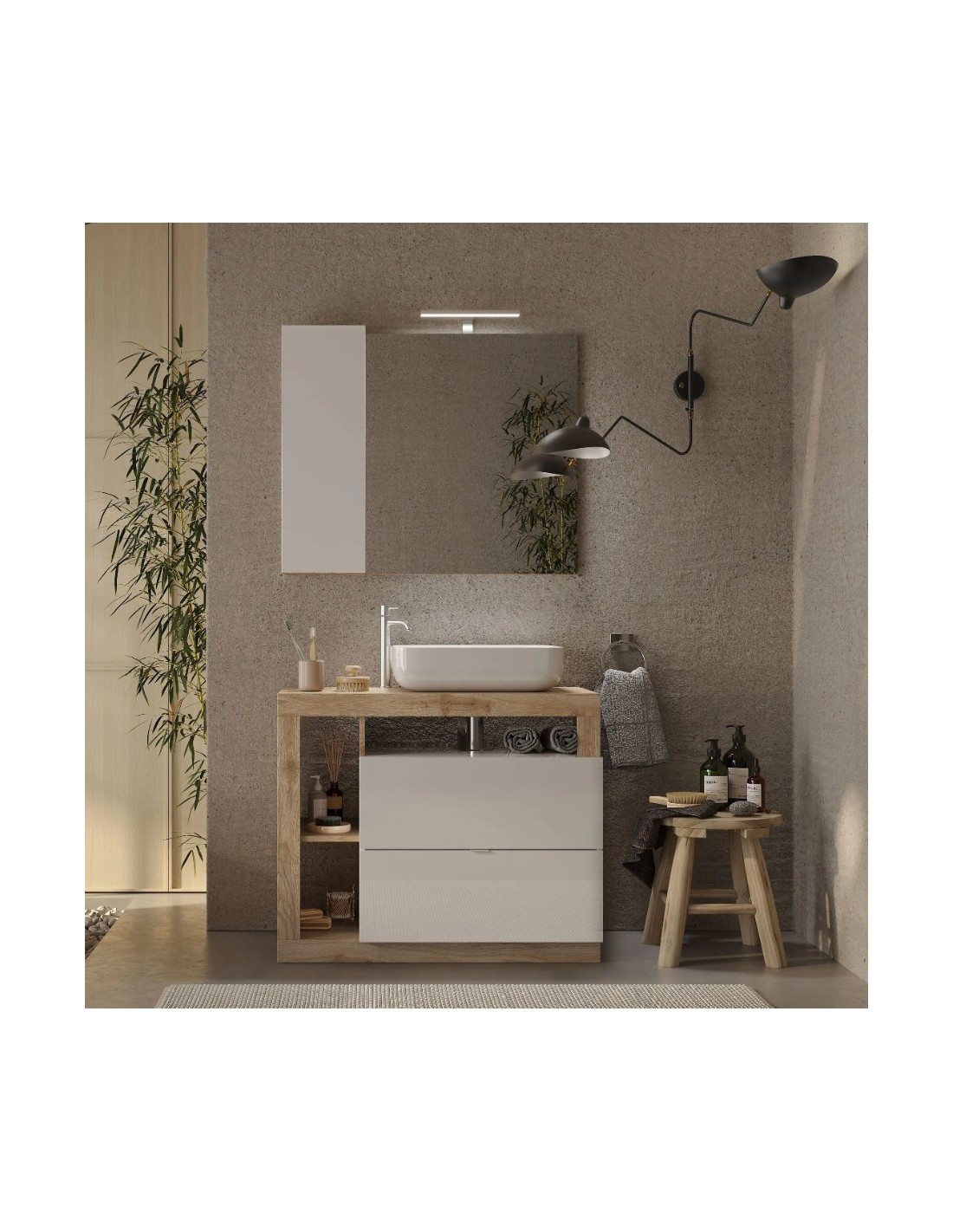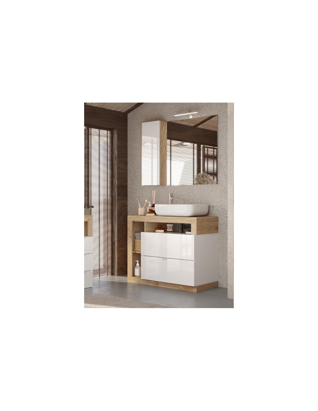 Mobile bagno sospeso 1 cassetto con ciotola Bianco laccato/Rovere (Specchio escluso)