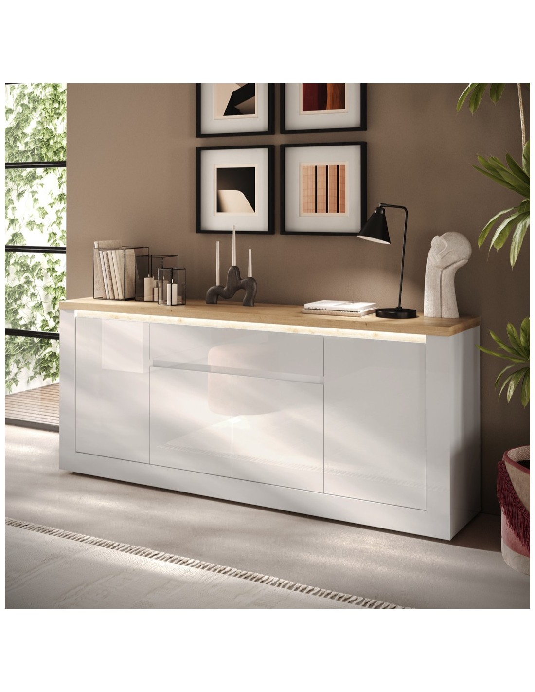 ll top superiore in rovere aggiunge calore e naturalezza, creando un bel contrasto con la struttura in bianco lucido, che dona luminosità.