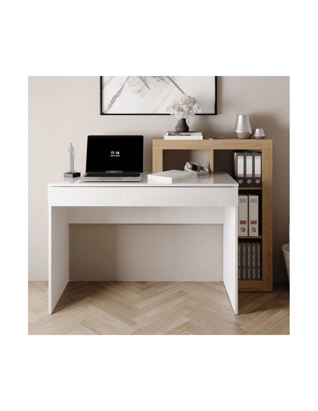 Scrivania consolle trasformabile con piano e cassetto estraibile.