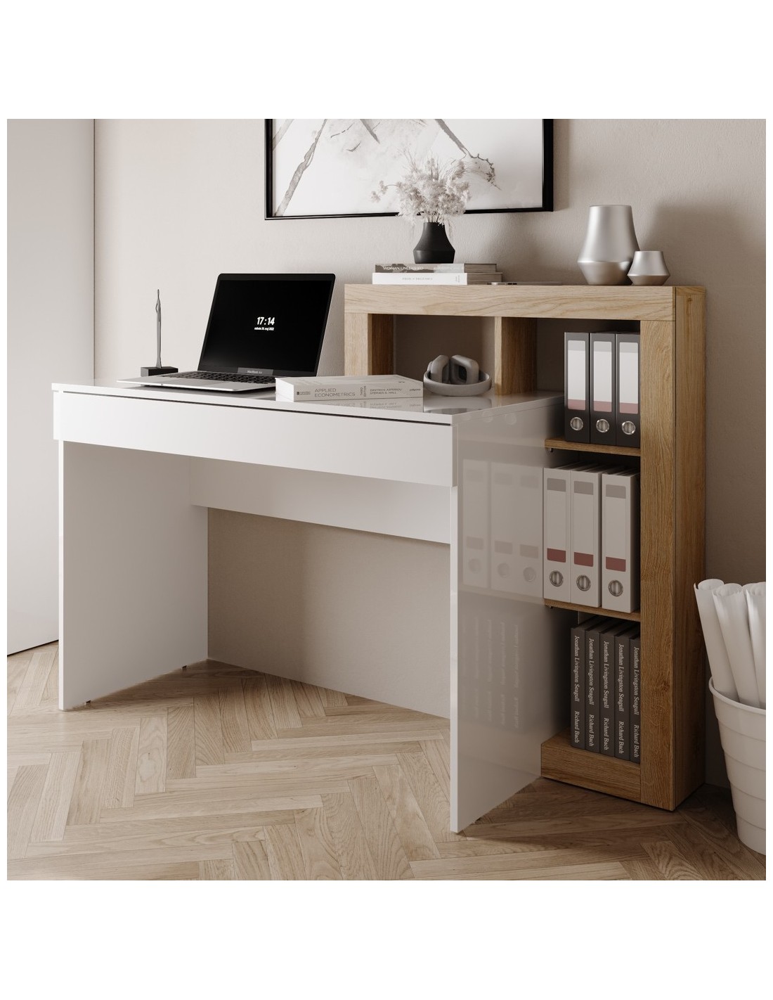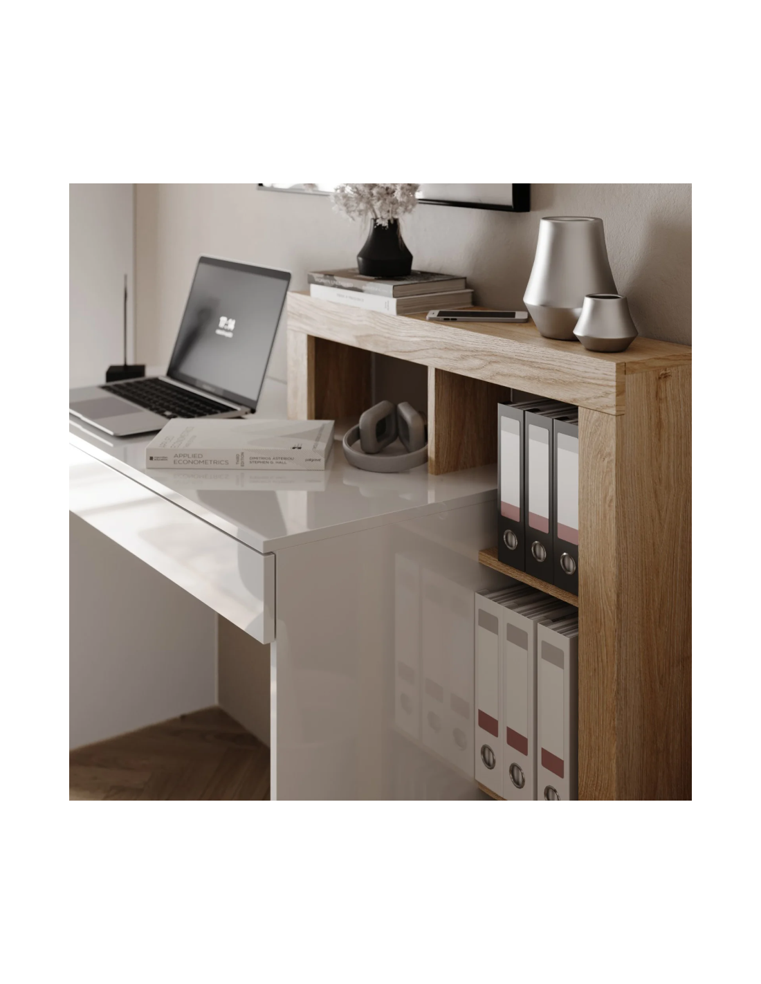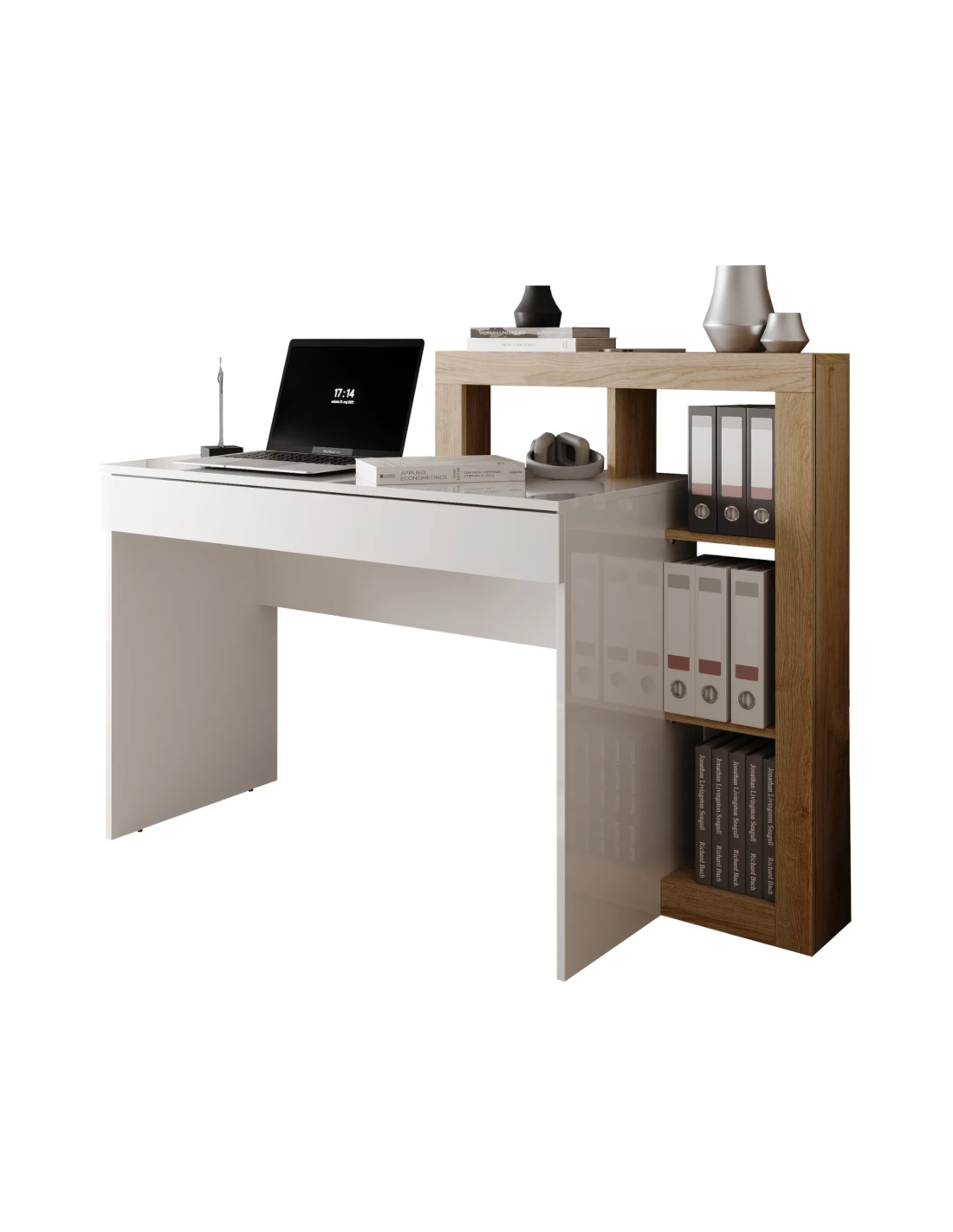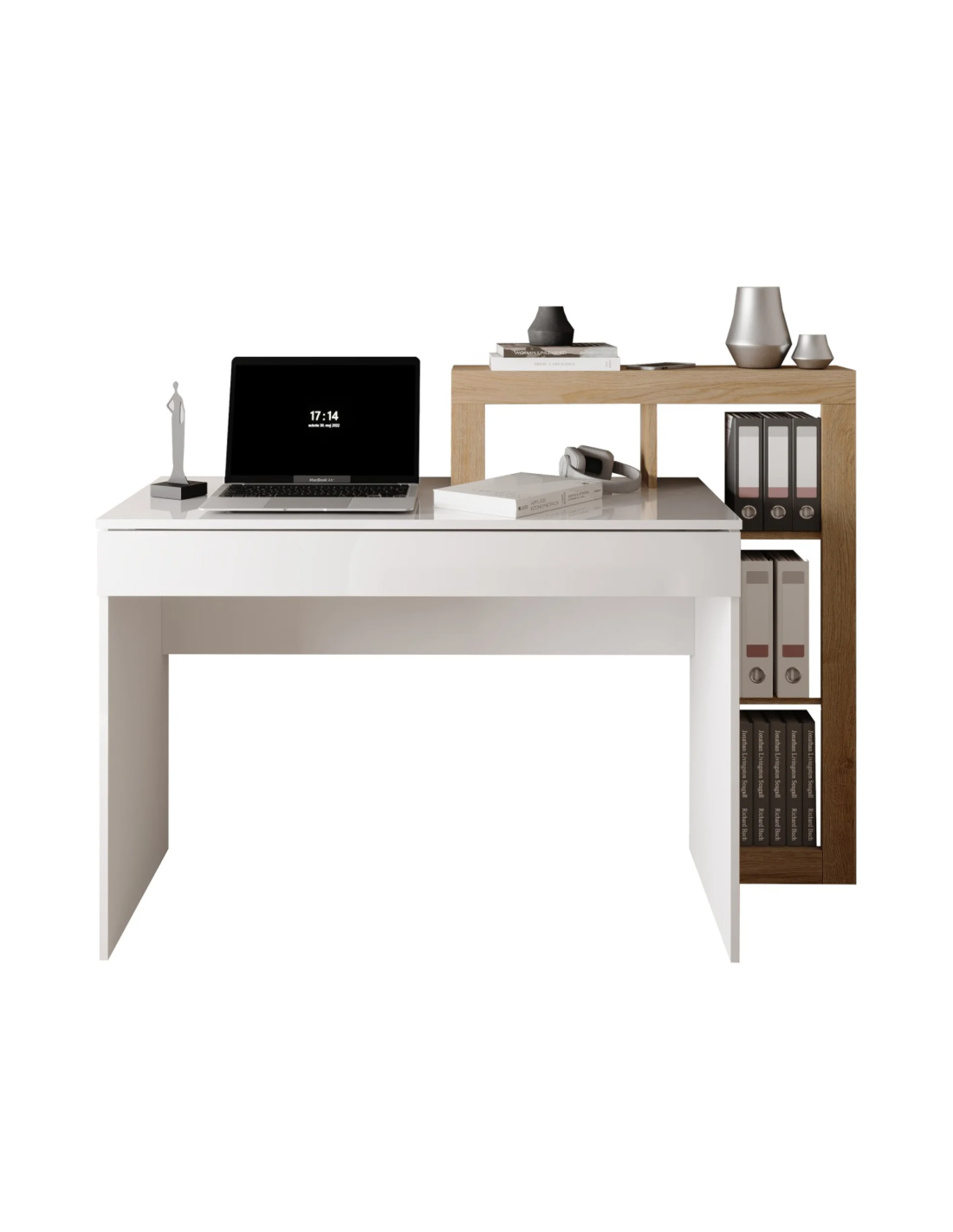 Scrivania Kubo 1 cassetto con libreria Bianco laccato lucido/Rovere