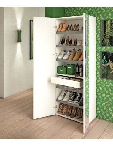 Le due ante celano un cassetto interno e ben sei ripiani con frontalino.