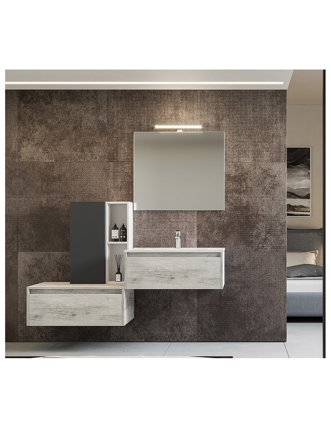 Mobile bagno Eva 100 cm 2 cassetti + specchio con faretto Rovere fumo/Bianco laccato