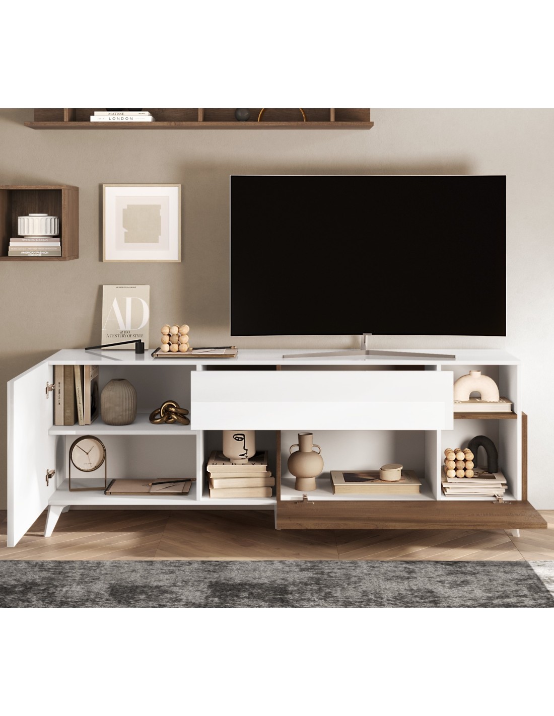 Questo mobile TV ha un design elegante e contemporaneo con uno stile unico nei suoi dettagli.