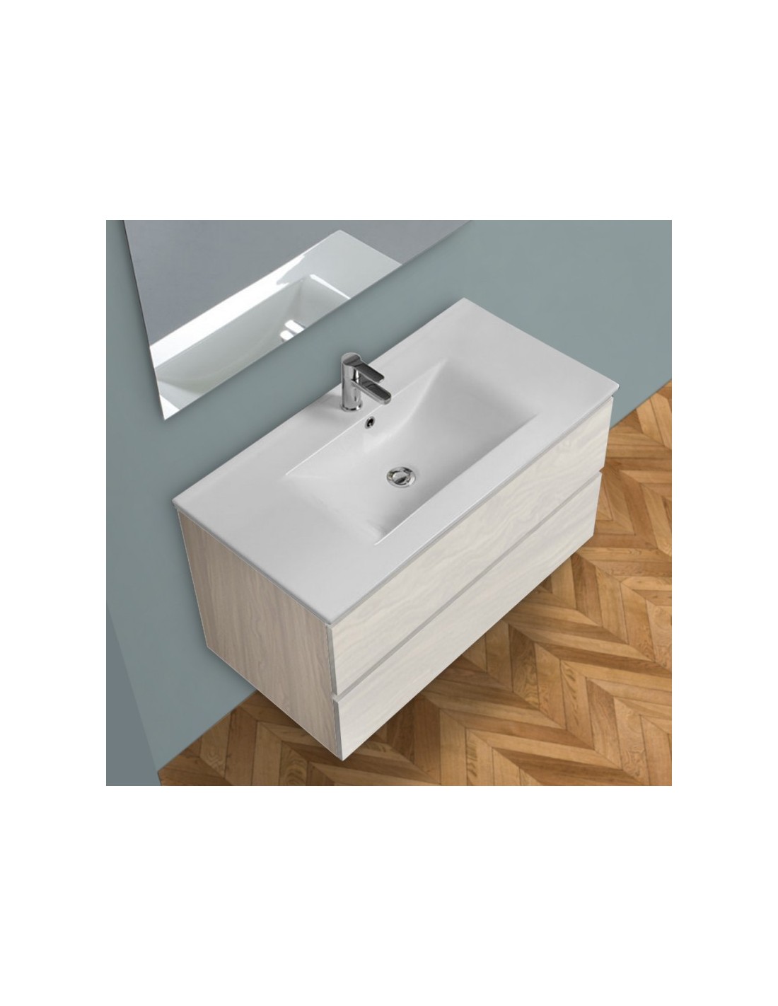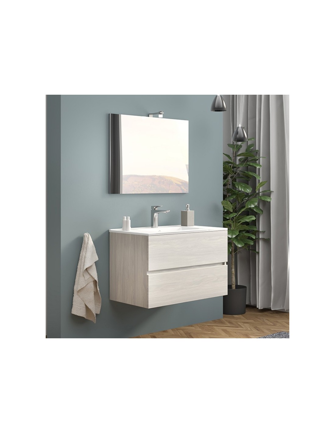 Lavabo in ceramica + mobile sotto lavabo sospeso con due cassetti + specchio + lampada.
