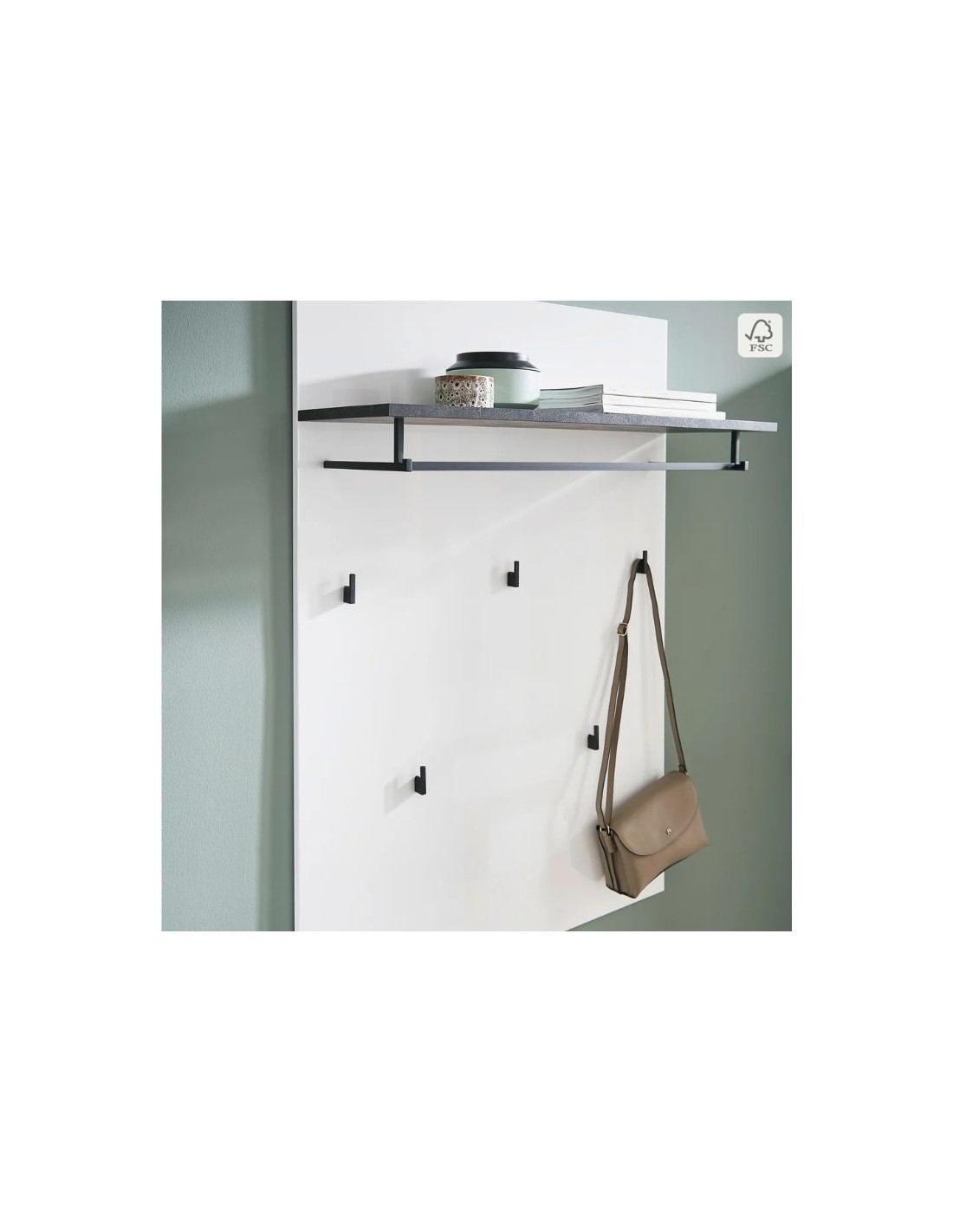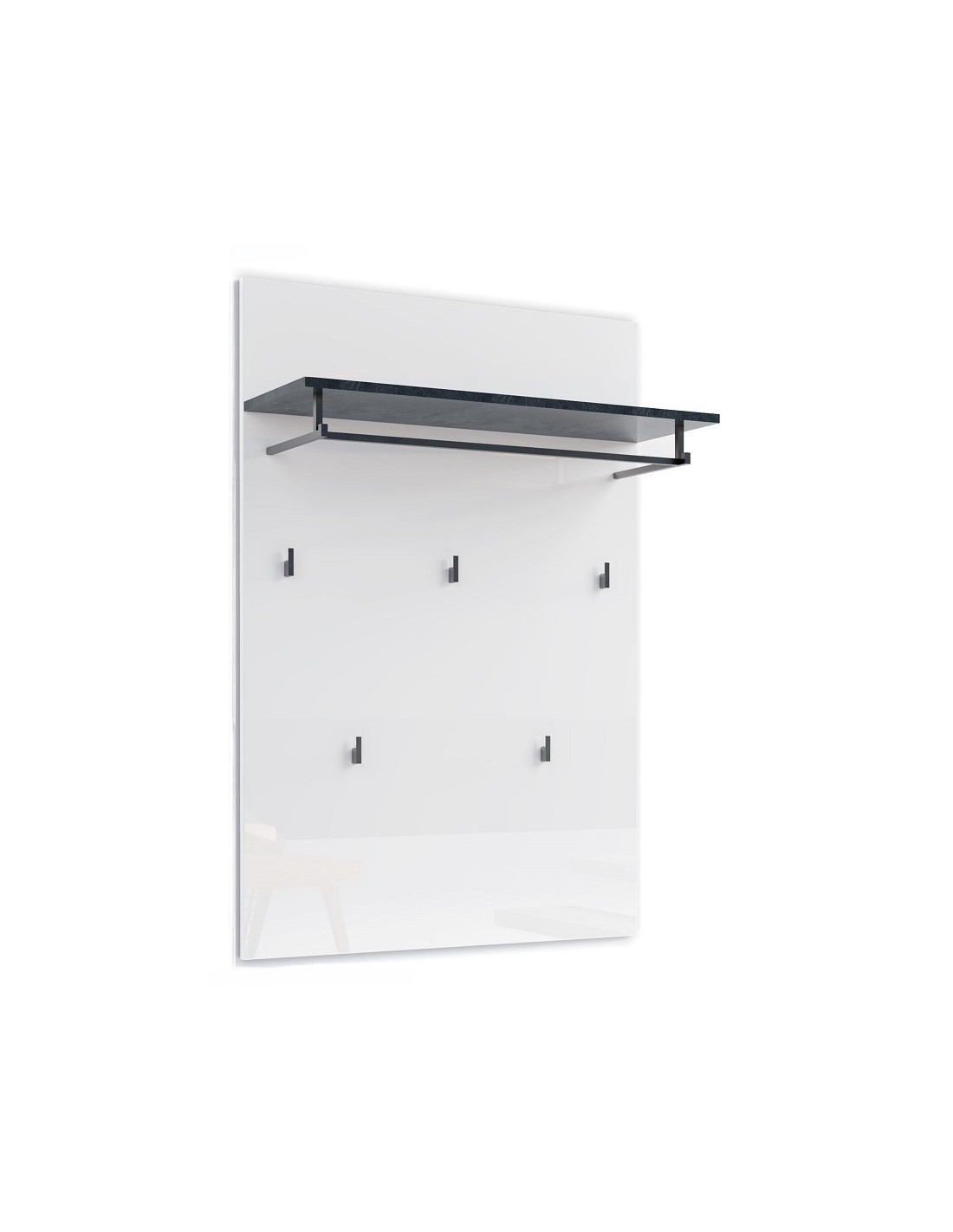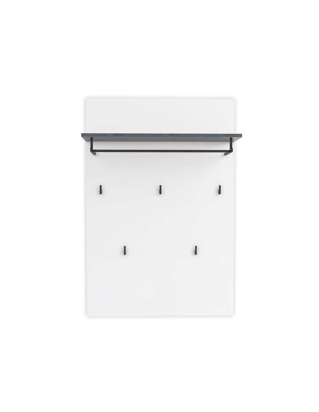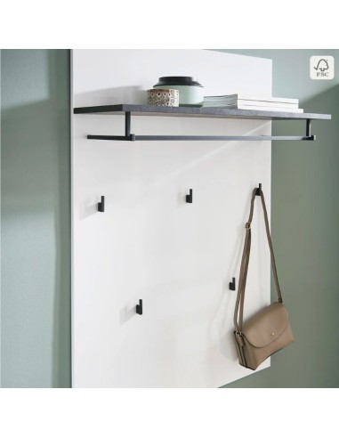 La combinazione di colori completa il design di successo: sul pannello bianco lucido sono montati ganci, asta appendiabito e ripiano in colore contrastante.