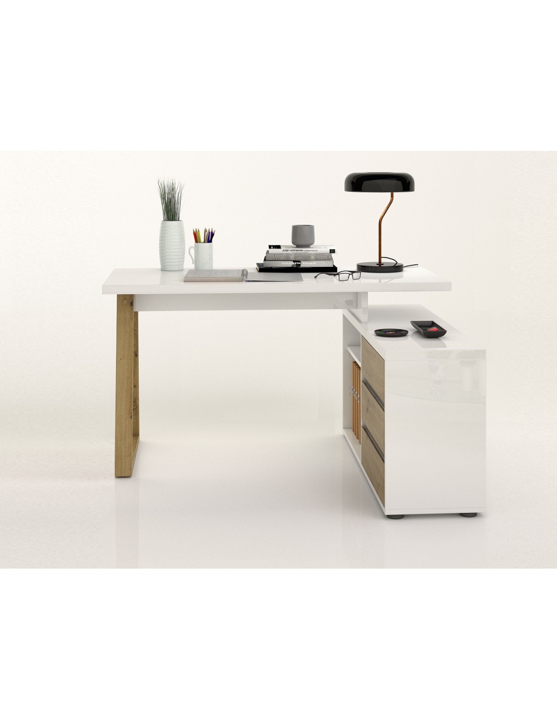 Scrivania angolare 3 cassetti Bianco laccato/Rovere artisan